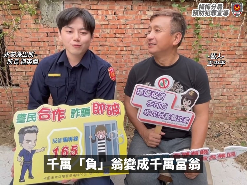 知名藝人「王中平」受到桃園楊梅警分局邀請拍攝反詐欺宣導短片,分享從「千萬負翁」翻身成「千萬富翁」的心得,再針對「假投資」詐騙手法進行分析破解,民眾觀看後能提升防詐意識,人人都能成為詐騙絕緣體。