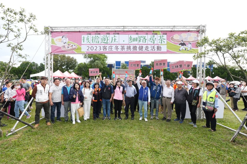 桃園市政府客家事務局29 日上午舉辦「2023客庄冬茶挑擔健走活動」,吸引數千位民眾到場共襄盛舉,健走路線從主會場石門大草坪出發,全長約4.7公里,沿線行經龍潭地區多處茶園,並能品嘗龍潭知名的龍泉茶與酸柑茶,邀請大家一起來暢遊客庄,品嚐冬茶,感受客家文化。