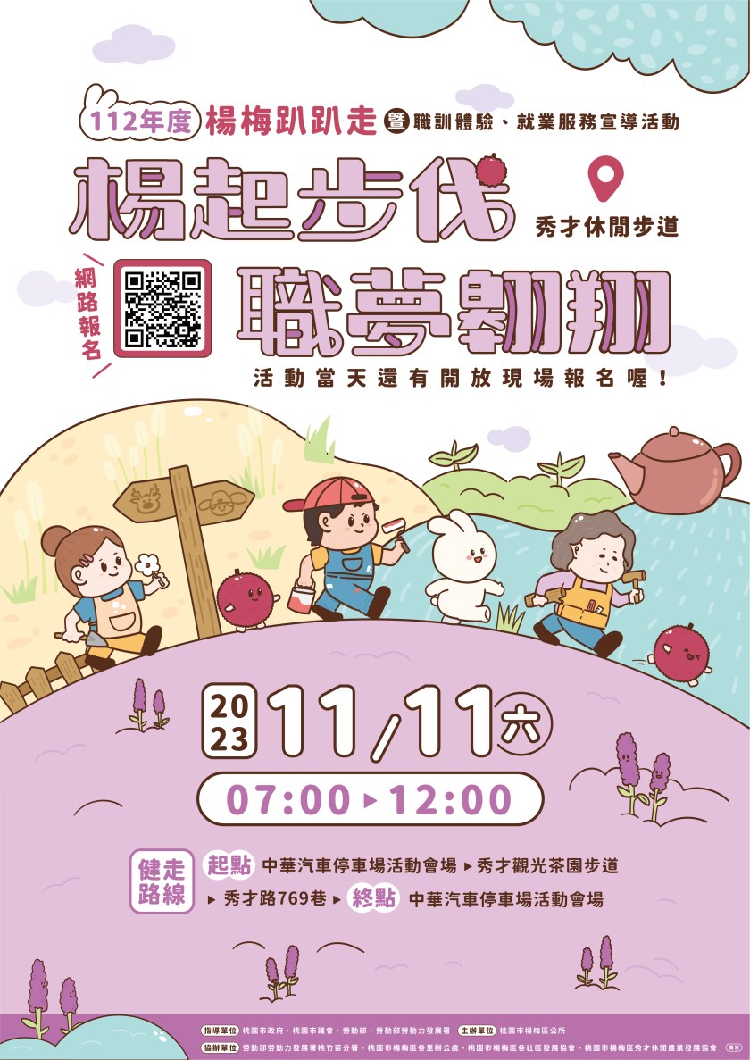 桃園市楊梅區公所及勞動部勞動力發展署桃竹苗分署訂於11月11日上午7點在中華汽車停車場及楊梅秀才步道,共同合辦「112年楊梅趴趴走暨職訓體驗、就業服務宣導」活動。