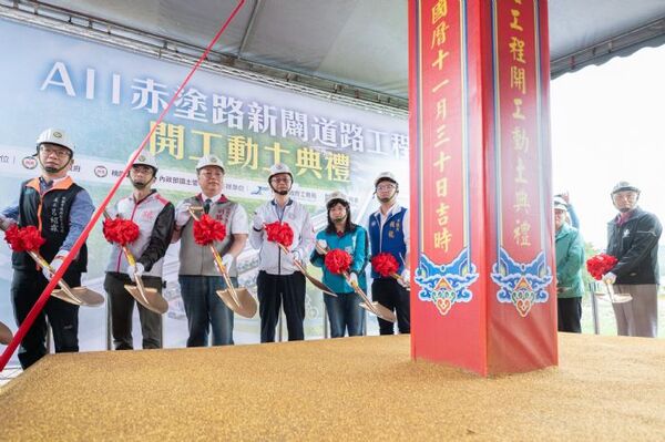 桃園市長張善政30日上午前往蘆竹區,出席「A11 赤塗路新闢道路工程」開工動土典禮。張市長表示,為活化機捷A11坑口站及A9a緊急停靠站捷運軌道橋下空間,市府辦理赤塗路道路新闢工程,延續先前完工的機捷路一段、二段,施作全長約530公尺、寬度約16至21公尺的新闢道路,本案經費約1億6,704萬元,其中國土管理署補助約8,145萬元,其餘則由市府自籌,全案預計明(113)年12月竣工,期待道路開闢後,不僅促進當地交通的便利性,也能透過騎車或散步,欣賞田園風光,打造休憩空間。