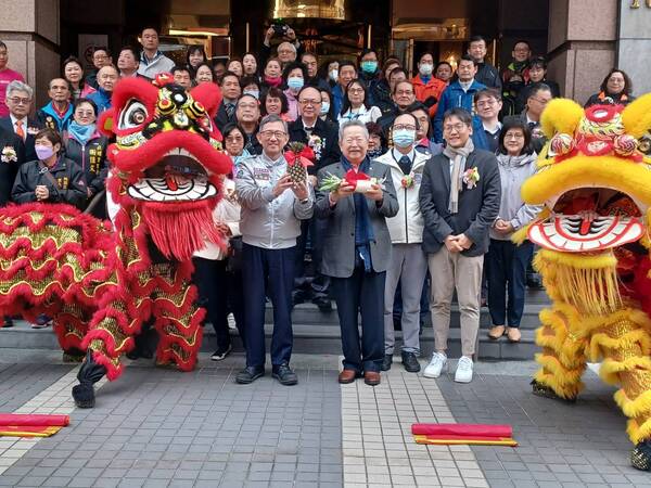 桃園市王副市長與敏盛集團楊總裁共同接下舞獅的菜頭與鳳梨象徵著敏盛智醫城好彩頭。