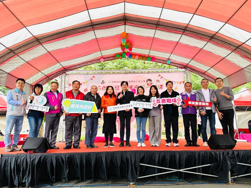桃竹苗分署長林淑媛(右6)與桃園市政府勞動局副局長周賢平(左7)及桃竹苗轄區各工會幹部、貴賓一起參與庇護商品公益市集啟動儀式。