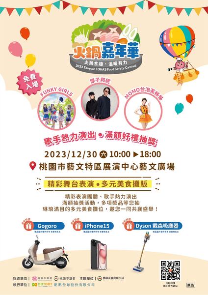 本次「火鍋嘉年華」活動及獎品相當豐富,有邀請知名樂團原子邦妮、Funky girls舞團熱鬧表演、還有MOMO家族泡芙姊姊帶動親子唱跳,同時舉辦「食安知識搶答」、「食安小超市」等趣味互動遊戲,大啖美食還能同步獲得食安知識與好禮。桃園衛生局自112年底展開桃食饗宴好康多重奏,除了「火鍋嘉年華」一日活動之外,更與在地優質溯源餐廳合作美食券消費,即日起民眾只要到桃食安心資訊平台官網首頁(網址:https://food-safety.tycg.gov.tw/),點選連結參與「店家推廣王」並完成指定活動即可獲得美食券與摸彩卷,美食券使用自即日起至113年1月31日止,可於桃園數百間優質溯源餐廳使用,名額有限領完為止,趕快把握機會!