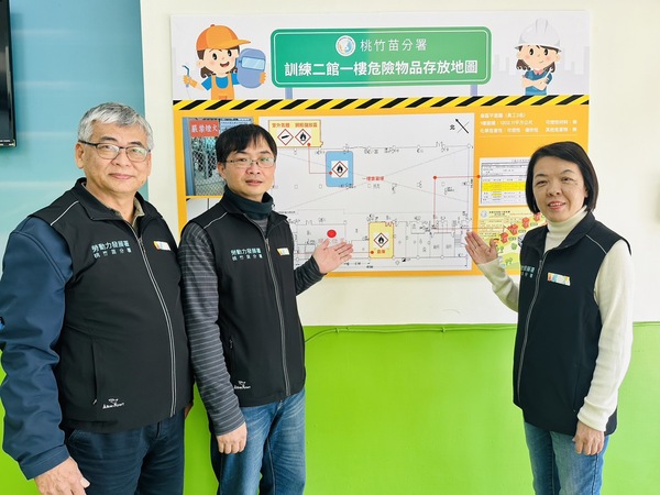 為了預防類似屏東某工廠因未能充分掌握廠內化學物質而導致爆炸大火的意外事件,勞動部桃竹苗分署積極針對分署內部職業訓練場實習場域進行職業安全衛生檢視,其中也針對訓練中所使用到的甲苯、香蕉水等化學品以及液化石油氣、乙炔等危險物品,特別製訂8處危險物品存放地圖,希望藉由完整揭露危險物品資訊及有效管控,提高職業安全衛生標準,確保每位學員在訓練過程中都能夠享受到最優質的保護和照顧,進而為在訓學員及辦公同仁打造安穩、安心及安全的訓練及工作場域。