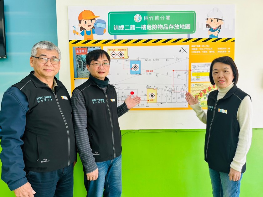 為了預防類似屏東某工廠因未能充分掌握廠內化學物質而導致爆炸大火的意外事件,勞動部桃竹苗分署積極針對分署內部職業訓練場實習場域進行職業安全衛生檢視,其中也針對訓練中所使用到的甲苯、香蕉水等化學品以及液化石油氣、乙炔等危險物品,特別製訂8處危險物品存放地圖,希望藉由完整揭露危險物品資訊及有效管控,提高職業安全衛生標準,確保每位學員在訓練過程中都能夠享受到最優質的保護和照顧,進而為在訓學員及辦公同仁打造安穩、安心及安全的訓練及工作場域。