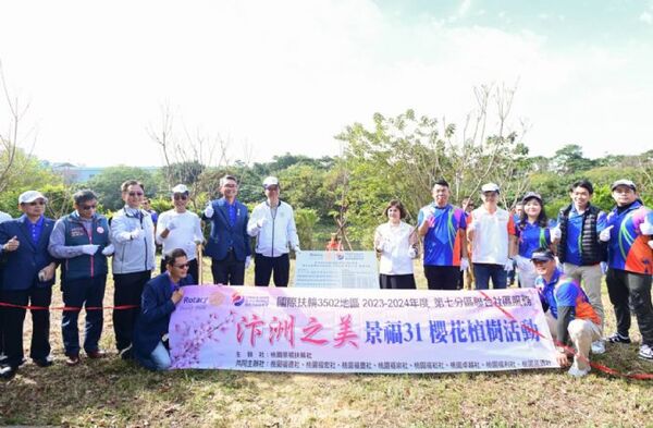 桃園市長張善政19日上午前往桃園區,出席「桃園景福扶輪社南崁溪水岸櫻花植樹活動」。張市長表示,在過去3年市府多次與扶輪社合作,美化約1公里的風景路段,包括110年在南崁溪水汴頭大橋沿岸種植100棵黃花風鈴木、111年在水岸街沿岸種植100棵吉野櫻、112年則種植50棵吉野櫻,今年桃園景福扶輪社也於南崁溪水岸街自行車道旁種植了110棵吉野櫻,非常感謝景福扶輪社及其他扶輪社的貢獻,為河岸增添許多綠意。