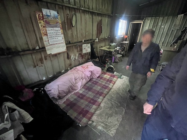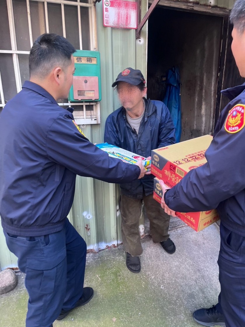 交通分隊平日在龜山區轄內巡邏時,經常見到一名68歲吳姓老翁四處撿回收,偶然上前關心之下發現老翁有輕度語言障礙,導致平時無業只能靠撿回收物品變賣以維持生計,昨日下午小隊長曹永政與警員林忠慶共同前往老翁家中關懷,發現他住在家徒四壁的破舊鐵皮屋內,僅在水泥地上鋪上一層棉被充當床墊,最近日夜溫差大常常讓老翁冷到睡不著,且家中的存糧已經吃完不知道如何度過年關,員警知情後特別送上白米、泡麵及乾糧等物資慰問,希望這點棉薄的心意能多少幫助老翁度過寒冬,也讓老翁感動到說不出話來,只能頻頻鞠躬、點頭像員警道謝,感恩之情溢於言表。