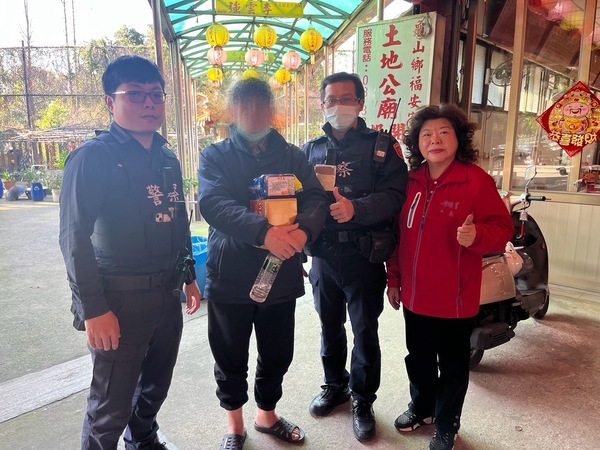 16日中午12時許,大林所警員唐澤濠、陳瀅翔在巡邏時,順道拜訪轄內獨居的75歲陳姓老翁,見他神情落寞獨坐家中,便暖心邀請陳翁前來派出所共進午餐,讓陳翁找回年節的團圓感。下午15時許,警方獲報福安宮外有一名70歲陳姓老翁獨自徘徊,巡邏警員陳瀅翔、林遠泰立刻到場關心,發現老翁因前一晚與家人起爭執而不願返家,員警憂其挨餓受凍便提供暖暖包及乾糧給老翁補充熱量,並協助他與家人聯繫排解爭執,才讓老翁終於願意返家。