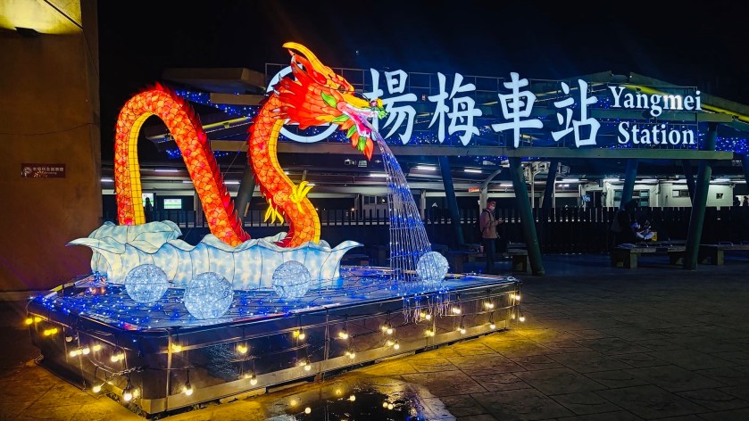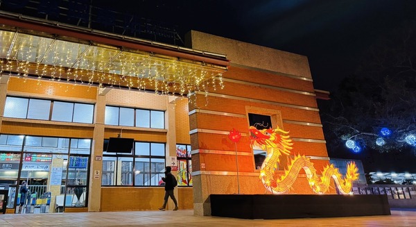 楊梅客庄藝術燈區今年設置6大展區,包括楊梅區4處車站廣場、楊梅區公所前及中山親水公園等處,藝術主燈「龍騰灑甘露」於楊梅火車站展示,以「龍吐水」為其意象,透過光影變化,打造宛如活龍般,帶來祥瑞徵兆,展區還有埔心火車站的「龍光煥發」、富岡火車站「龍騰吉祥」,以及在新富火車站設置的「璀璨七彩」燈飾,每一處都呈現龍年的祥瑞元素。