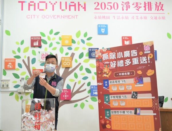桃園環保局為鼓勵民眾協力撕除違規小廣告,21日於環保行政園區2樓階梯教室舉行「撕小廣告換好禮」公開抽獎活動,共抽出38位得獎者,共有65吋液晶電視3台、平板電腦5台、智慧型手機10台及變頻微波爐20台等多項獎品,讓民眾透過做環保也能有「獎」不完的好禮可拿。