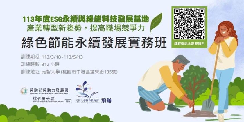 為協助有志於從事綠能產業民眾投入職場,及媒合國內中小企業因應2050淨零排放目標人才迫切需求目標,勞動部勞動力發展署桃竹苗分署與2023年榮獲經濟部「節能標竿金獎」及「國家永續發展獎」之元智大學攜手成立了「ESG永續與綠能科技人才發展基地」,開辦「綠色節能永續發展實務班」,即日起受理失業民眾報名,課程補助80~100%的訓練費用,除了培訓低碳轉型所需的專業技能,並輔導結訓學員就業。