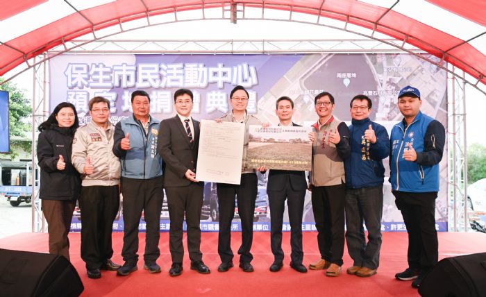 桃園市長張善政9日上午前往觀音區,出席「保生市民活動中心預定地捐贈典禮」。張市長表示,感謝山立通運股份有限公司及八達交通股份有限公司捐贈土地造福鄉里,這也是他上任後第一件土地捐贈案,市府會盡快變更地目,並規劃運用台電促協金及中油三接回饋金支應興建經費,盼加速完成保生市民活動中心,滿足觀音區市民集會活動所需。
