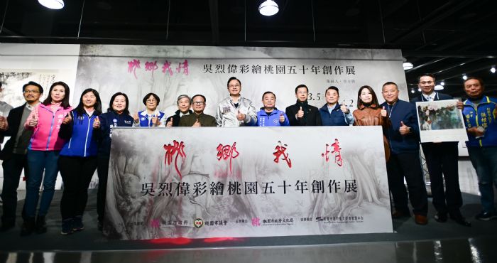 桃園市長張善政今(9)日下午前往桃園展演中心,出席「桃鄉我情-吳烈偉彩繪桃園五十創作展」開幕記者會。張市長表示,吳烈偉老師是桃園在地傑出書畫藝術家,創作半世紀,作品主題多以桃園的風土人情為主,運用水墨、彩筆等不同媒材,此次展出超過50件作品,其中多幅超過500公分的巨作,十分壯觀,歡迎愛好藝文的市民朋友踴躍前來參觀,透過吳老師的畫作欣賞藝術、感受桃園之美。