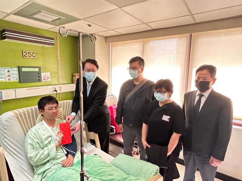 內政部長林右昌25日上午,至桃園林口長庚醫院,探視前日深夜追捕嫌犯過程遭受槍傷的桃園警察同仁蔡淳宇,淳宇經過開刀治療,狀況已經穩定,部長也特別頒贈慰問金,特別感謝他的英勇,並祝福早日康復,好好休養後再回到崗位上,維護社會治安。