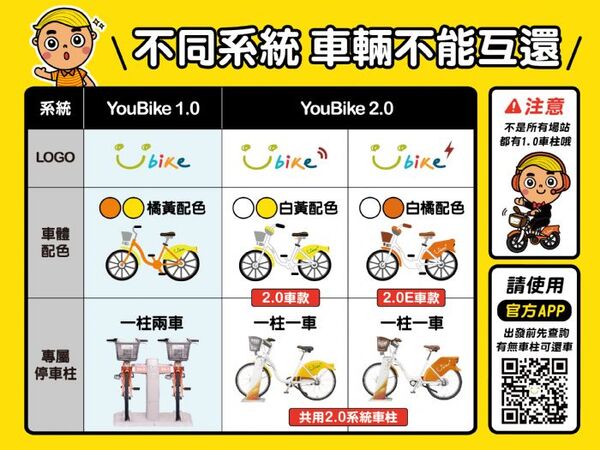 交通局提醒,在「新系統拆轉期」1.0系統將陸續下架,騎乘公共自行車的民眾,請下載「YouBike微笑單車」官方App,出門前查詢可了解最新1.0、2.0系統場站的位置及場站狀態,避免因系統不相容面臨「無該系統車柱」還車的狀況;民眾亦可至YouBike官網查詢近期拆轉公共自行車場站相關資訊,場站設備如於施工期間將暫停租借使用,如有造成不便之處敬請見諒,也謝謝市民朋友對於拆轉期的體諒以及新系統2.0服務的支持。