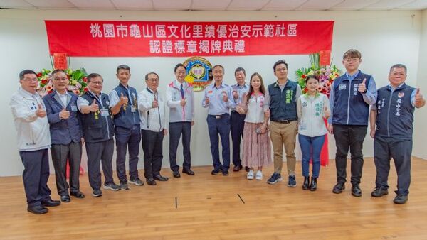 警察局表示,桃園市績優治安示範社區認證標章每年辦理1次,其評核內容包括警政、社政、消防等三大面向工作,龜山區文化里守望相助隊於108年10月成立,112年首次參加本市社區治安輔導團隊評核,即獲得本市績優治安示範社區成長組認證標章,實屬難得。包括市議員李宗豪、孫韻璇、陳雅倫、市府警察局長吳坤旭、社會局專門委員李祐銘、龜山區長張嘉平、桃園市守望相助隊副大隊長游志乾、中隊長許森能、民防中隊長蔡炤正、龜山區文化里守望相助隊分隊長李明堂、副分隊長暨文化里長黃明助、龜山區里長聯誼會長暨大華里長潘素秋等均一同出席。