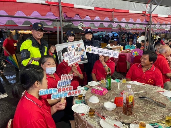 桃園市政府警察局楊梅分局結合廟方慶典活動,進行「識詐」宣導,針對常見詐騙手法,包括「假投資詐騙」、「假網拍詐騙」及「ATM解除分期付款」等,教導民眾如何辨識詐騙,呼籲民眾接獲任何資訊及電話,務必提高警覺,謹記「一聽」、「二掛」、「三查證」步驟,多加查證,提高警覺。