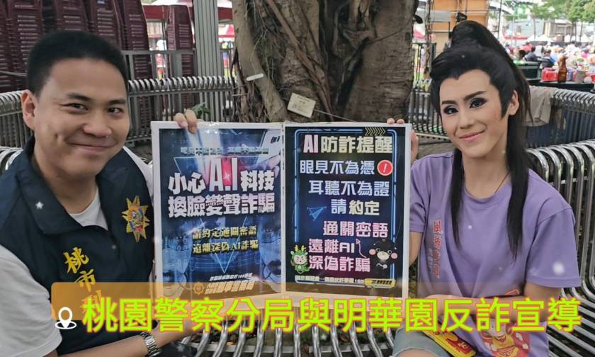 桃園警察分局落實執行警政署「新世代打擊詐欺策略行動綱領識詐1.5」宣導工作,本次與明華園總團執行長-陳昭賢女士一同進行反詐騙影片錄製,陳昭賢執行長表示:隨著時代的進步與變遷,歌仔戲需要不斷地創新及文化轉型;沒想到詐騙集團的歹心及手法也層出不窮,日益更新,打擊詐騙真是刻不容緩,不容小覷。本次陳昭賢執行長與偵查隊副隊長黃尚緯一同進行目前犯行最猖獗的AI詐騙影片錄製,期許能藉由反詐影片讓更多民眾知悉詐騙集團的套路,免於受騙。