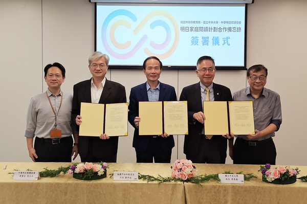 母親節前夕,為促進閱讀成為孩子日常生活與終身學習的核心,實現「生活即閱讀」,國立中央大學、桃園市政府教育局、桃園市立圖書館及中華明日閱讀協會,5月10日共同簽署合作備忘錄,跨域產官學研攜手推動「明日家庭閱讀計畫」,期盼藉助中央大學成功推廣「明日閱讀」至全臺逾2,000校的經驗,帶動家庭共讀風氣,打造桃園成為全國家庭閱讀典範。