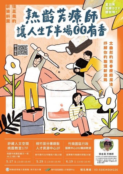 勞動力發展署桃竹苗分署目前也正積極協助推動倡議銀髮勞動議題、企業世代合作、經驗傳承、職場體驗徵才及輔導申請各項措施及補助計畫,本次倡議系列講座「熟齡芳療師 讓人生下半場日日有香」有5月17日(桃園場)、5月29日(竹北場)及6月19日(竹南場),歡迎有興趣的民眾致電桃竹苗區銀髮人才資源中心洽詢電話03-5583456 #226陳小姐,或上https://pse.is/5usr4w報名,更多中高齡就業相關訊息可上「45+就業資源網」https://45plus.wda.gov。