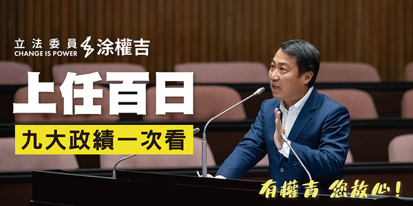 涂權吉羅列九大政績表現,其中不僅直指民進黨八年施政的弊端與懈怠,也透過法律提案與質詢,一一兌現競選政見並回應地方建設需求,涂權吉表示,過去百日總括兩句話就是「顧長護幼拼建設、挺弱為民抱不平」,貫徹自己長久以來秉持「基層出身、為民發聲」的問政理念。