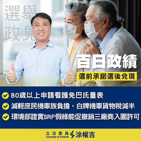 我國眼見明年就要邁入超高齡社會,但看護人力仍需才孔亟,涂權吉業已提案修法讓80歲以上長者申請看護免除詬病已久的「巴氏量表」,目前法案靜待委員會審查。《貨物稅條例》實施近80年,隨著時空背景的變化,機車早以從奢侈品成為生活必需品,故涂權吉修法提案減輕庶民機車族負擔,讓白牌機車貨物稅得以減半!有關SRF焚化爐爭議,涂權吉自去年宣布參選立委以來就主張「SRF非綠電」,日前質詢環境部證實SRF是假綠能,隨即促市府順應民意撤銷三家SRF廠商入園許可,在多方的合作努力下,涂權吉也兌現了「為觀音鄉親爭一口乾淨空氣」的承諾。