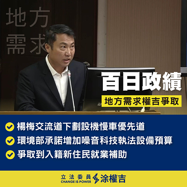 距第十一屆立委就職迄今剛好滿百日,新科的桃二選區立委涂權吉特別在10日,於臉書粉專發文並製作短影音、圖卡等,向地方鄉親報告這100天來的問政成績單。