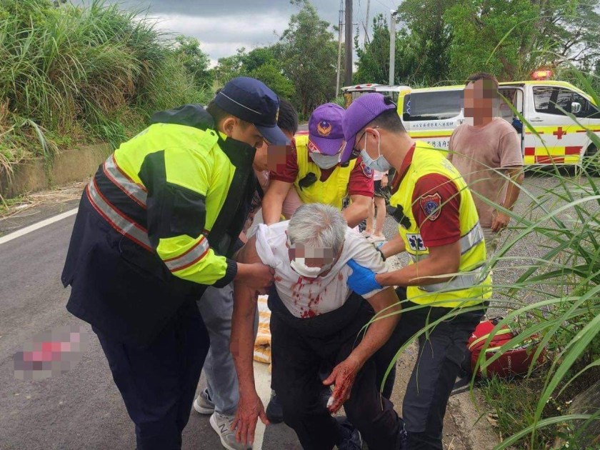 同一天上午81歲的徐姓老翁在梅龍路散步時疑似中暑暈眩倒地,滿臉鮮血。龍潭警分局聖亭派出所的巡佐陳秉贏和警員吳昆達在巡邏中發現了老翁,立即上前查看情況。