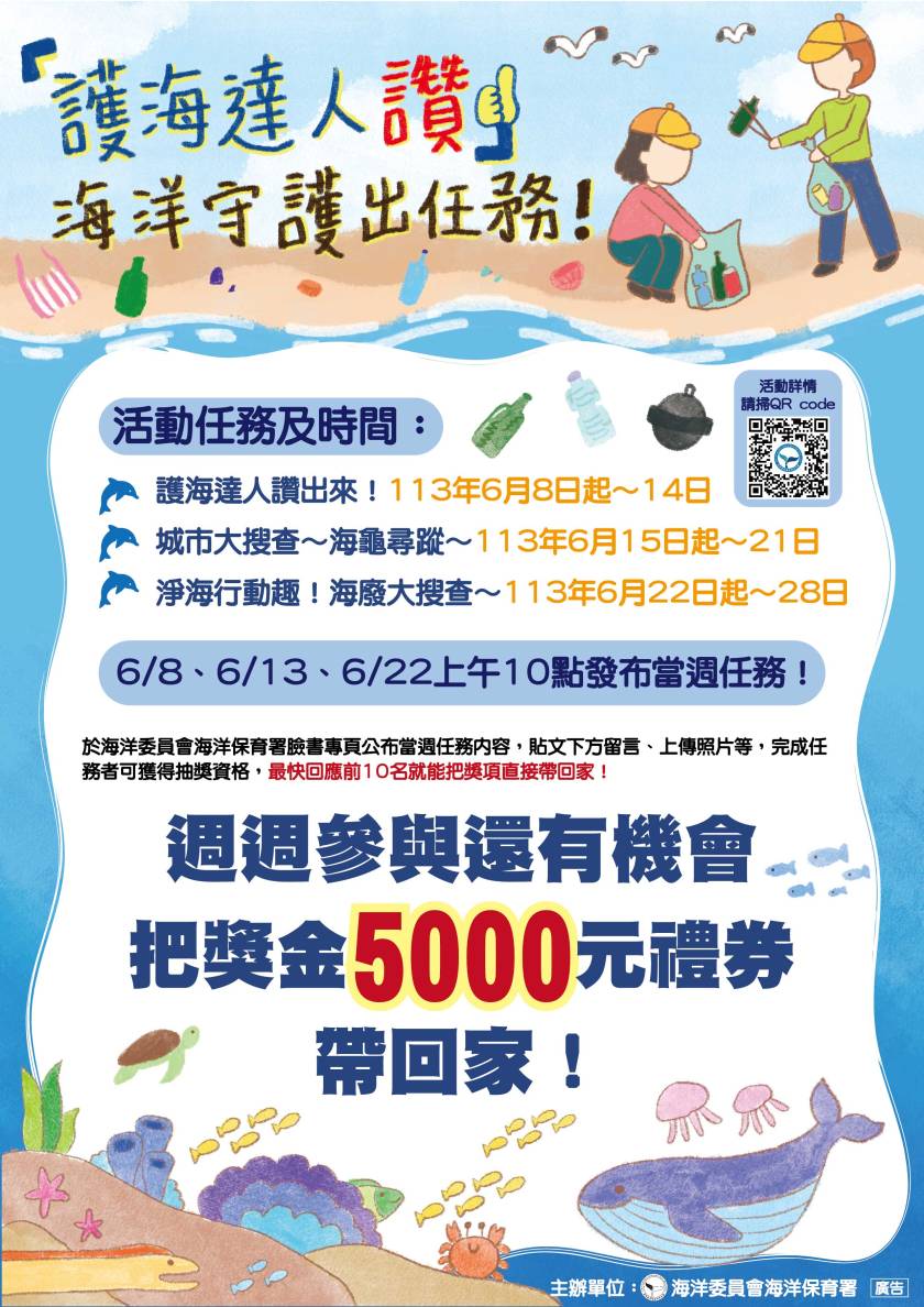 海洋委員會海洋保育署為響應國家海洋日,自6月8日起連續三週於海保署臉書專頁,展開「護海達人~讚!海洋守護出任務」線上趣味競賽活動,週週參與並完成任務有機會抽到最大獎禮券5,000元,活動詳情請至「海洋委員會海洋保育署」臉書專頁:https://reurl.cc/Djerd5。