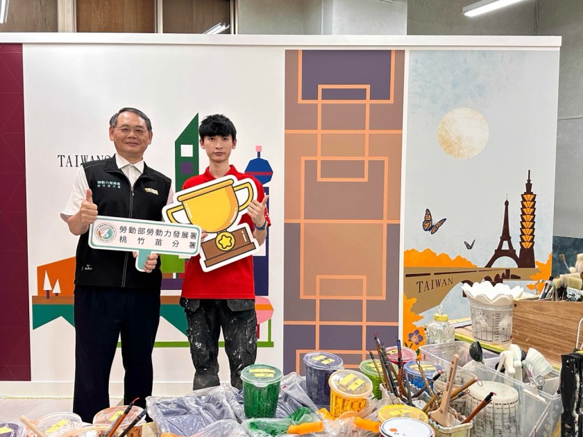 桃竹苗分署培訓的漆作裝潢職類國手李俊誠(右),將赴法國出戰第47屆國際技能競賽,賴家仁分署長(左)為他加油並期取他為國爭光。