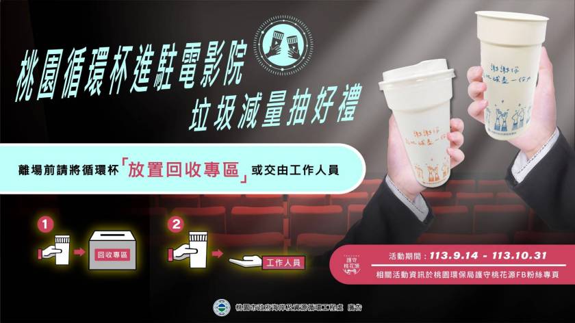 為擴展循環杯使用場域,桃園市於今(113)年3月起與桃園知名影城合作推廣飲品使用循環杯,讓民眾一起參與垃圾源頭減量,為鼓勵民眾觀賞電影時可選擇使用循環杯,桃園市政府於9月14日至10月31日擴大辦理看電影用循環杯即可參加抽獎活動,將抽出電影票券個人100組、包場團體10組。