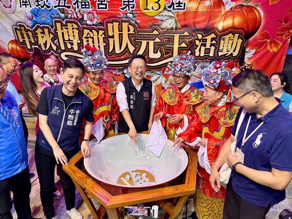桃園市副市長蘇俊賓12日晚間前往南崁五福宮,出席「南崁五福宮第13屆中秋博餅狀元王活動」。蘇副市長表示,南崁五福宮建廟已逾三百年,而「中秋博餅狀元王」活動,則是源自鄭成功駐守臺灣時期,為解官兵思鄉之苦,特別於中秋期間舉辦博餅活動,代代相傳至今,因此「中秋博餅」不僅是五福宮的傳統,也是臺灣特殊的無形文化資產,更是桃園重要的閩南文化傳承項目。