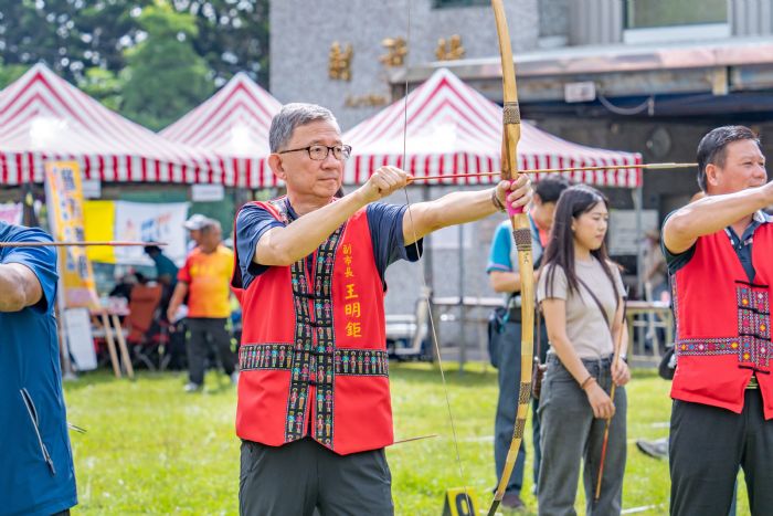 王明鉅到場後,首先逐一與參賽隊伍打招呼,歡迎遠道而來的各縣市參賽隊伍並為他們加油打氣;隨後,與出席貴賓一同完成開弓儀式,宣布賽事正式展開。