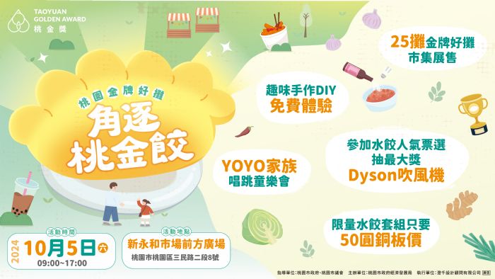 「2024桃園金牌好攤」主場活動即將於10/5(六)於新永和市場廣場登場,當天將舉辦「金牌好攤-桃金餃」年度主題評選,由10家傳統市場水餃攤位角逐桃金餃名號,桃園市政府更首度擴大辦理金牌好攤活動,現場除了有25家來自桃園及雙北傳統市場的明星攤位,展售自家優質的產品外,更有安排各種豐富的活動,包括50元換150元水餃美食套組、投票就抽最大獎Dyson吹風機等好康優惠,以及YOYO家族唱跳表演,不管大朋友、小朋友都可以到現場感受專屬於傳統市場的獨特魅力。