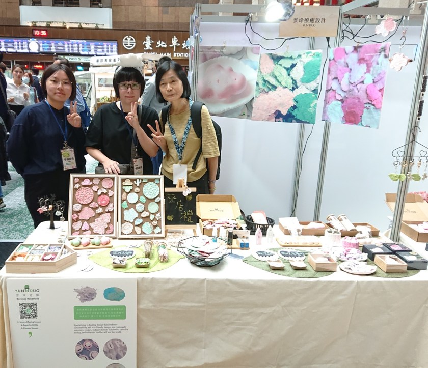專精於療癒設計的中原商設系鄭雲鳳助教,自就讀碩士在職專班以來,結合自身的專長與興趣創立了「雲垛」品牌,利用日常生活中產生的廢紙回收,設計並製作親子遊戲材料包。在這次的循環經濟新創展中,她與中原產品設計組的同學們合作,創作出多種可愛造型,並結合海洋廢棄物中的牡蠣殼粉製作出具有療癒情境的擴香石,充分展現設計專業與永續理念的結合。
