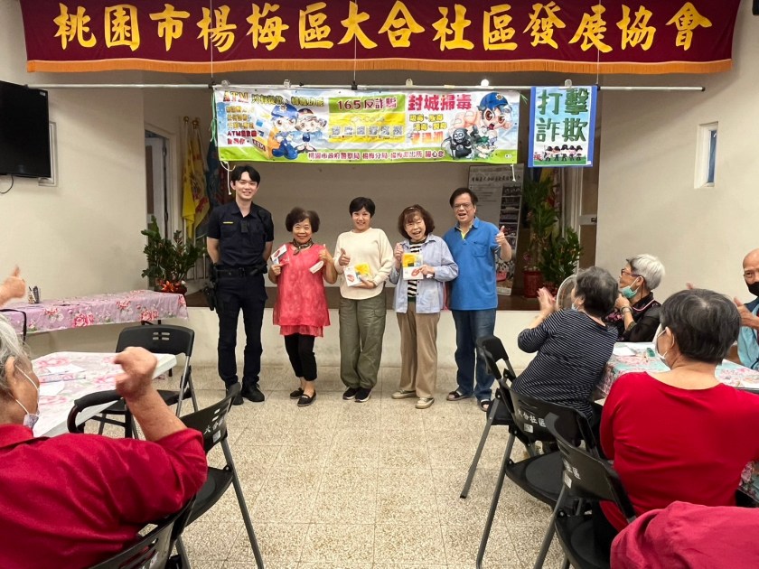 桃園市政府警察局楊梅分局為加強宣導保護婦幼、交通安全及反詐騙犯罪預防等基本觀念,楊梅派出所警員顧晉瑋 10月 24日結合楊梅區大合社區發展協會關懷據點深入淺出向民眾說明反詐騙、交通、防制家暴婦幼安全等宣導,以強化民眾安全常識及自我安全保護之觀念,警方並藉由現場直接面對面有獎問答贈送小禮物互動方式,將反詐觀念宣導給更多年長者,以免遭受詐騙的危險,並守護每位年長者的血汗錢。
