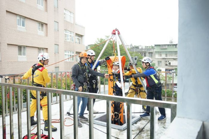 上午課程結束後,下午則藉由防災館的戶外訓練塔來重建侷限空間的救援環境,經犬隻定位傷患後,由救助及醫療等人員在狹小空間中執行傷患救援行動,利用常見的搜救器材、繩索救援技術,重現災害現場可能遭遇之垂直、斜面等立體傷患運送。