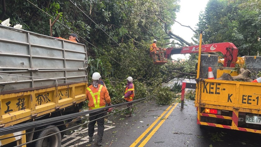 龜山區風大雨強也帶來多處災情。龜山分局大埔派出所於西勢湖路接獲電線桿與路樹一同傾倒的報案,雙向道路因障礙物阻擋暫時無法通行。警方到場後設置交通錐,並協助疏導車輛行駛替代道路,提醒用路人颱風過後須留意道路狀況,減速慢行以避免意外。