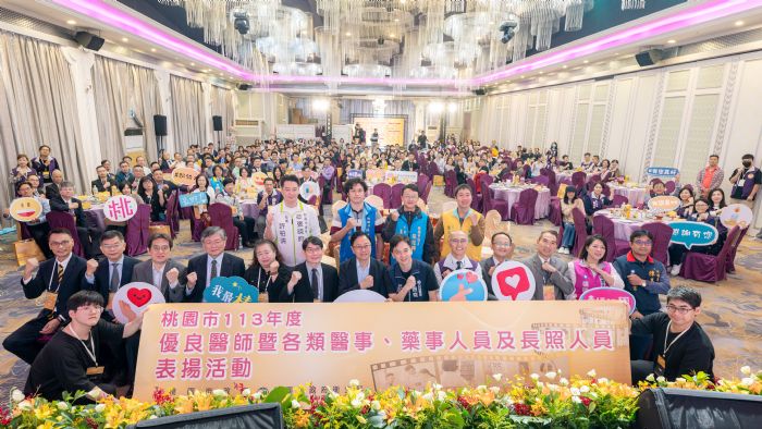 桃園市長張善政2日上午前往蘆竹區,出席「桃園市113年優良醫師暨各類醫事、藥事及長照人員表揚活動」,逐一頒發獎座予120名優良醫事人員及20名優良長照人員。張市長表示,感謝所有為市民健康服務的醫事、藥事及長照人員,以專業技術及無私奉獻的精神,提供市民最完善優質的照護,特別是在疫情期間及市府推動「擴大肺癌篩檢計畫」之際,即便工作負擔增加,仍堅守崗位辛勤付出,期勉未來持續與市府攜手共同提升桃園醫療量能,守護市民健康。
