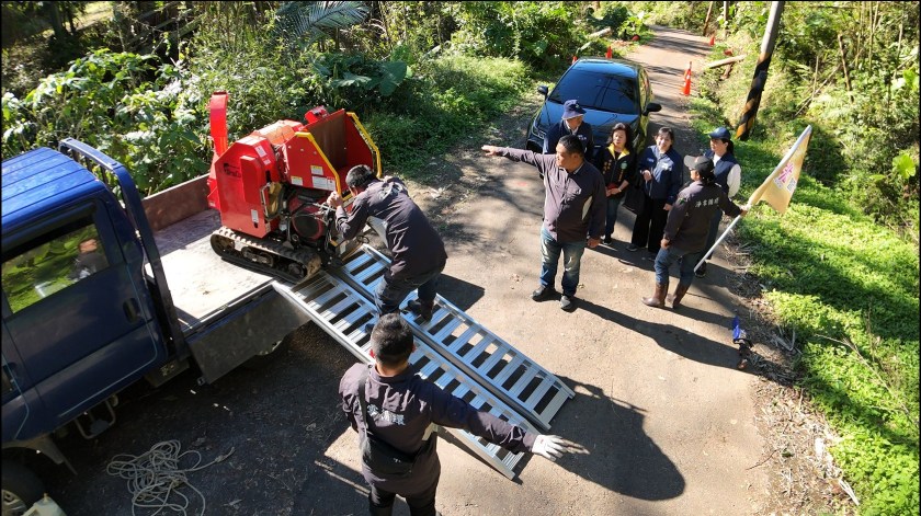 此外,桃園市政府也協調智慧農耕團「淨零中隊」出動碎枝機,協助清理災後倒塌的林木。這些倒塌的樹枝經過碎枝機的處理後,將被製成有機肥料,再次利用於農業生產,為災後恢復提供了有效的資源。