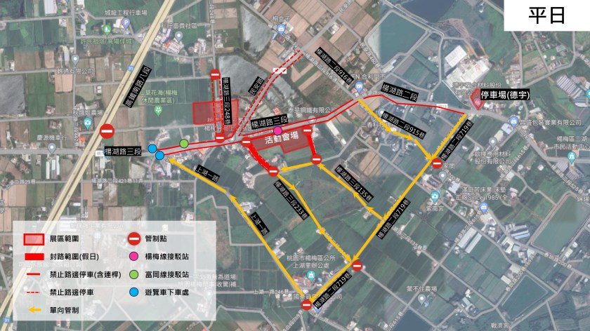 假日期間楊湖路三段(楊湖路二段916巷至民安路)、楊湖路三段248巷(楊湖路三段至展區北側產業道路)、楊湖路三段233巷(楊湖路三段至楊湖路三段233巷61弄)、楊湖路三段135巷(楊湖路三段至楊湖路三段233巷61弄)及展區北側產業道路(高鐵南路八段至楊湖路三段248巷)均採封閉管制,並管制大型車輛於楊湖路二段與泰圳路口改道行駛,於該路口左轉泰圳路再接上湖一路往台31線方向行駛;為避免造成車輛堵塞,楊梅警分局於各路口均有編排警民力於現場指揮引導,並請大型車輛駕駛配合指揮改道行駛。