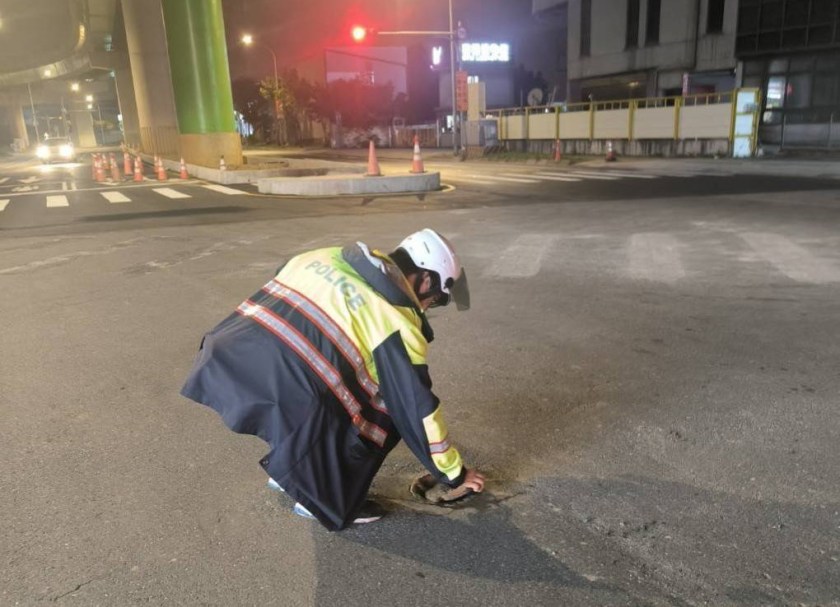 員警隨即前往該處查看,發現該路口有一處人孔蓋疑似遭車輛輾壓而與基座分離,為避免後續往來人車發生危險,員警立即以膠布將人孔蓋黏貼固定,避免車輛輾壓而彈開,並通報相關單位到場維修。
