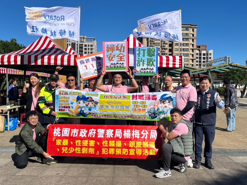 桃園市政府警察局楊梅分局為加強宣導保護婦幼、交通安全及反詐騙犯罪預防等基本觀念,由防治組組長吳黨元及楊梅派出所警員張赫文於11月24日至楊梅扶輪社所舉辦的捐血及公益園遊會活動現場(楊梅火車站站前廣場)宣導,現場有主辦社楊梅社社長談義光、前社長吳煥松、邱亞倫、吳承栩、秘書鍾明學及鄭祐昇、楊梅扶青社社長劉思佑、前社長潘耀寬、社員主委鍾榮貴、靜德社社長黃千玲、新屋社秘書吳美琴、3501地區秘書長郭淑琴、二分區助理總監林秋伶等暨社友多人捐血響應社會公益。