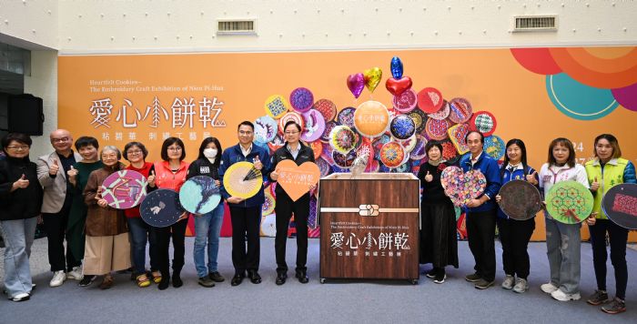 桃園市長張善政28日下午前往文化局,出席「愛心小餅乾—粘碧華刺繡工藝展開幕記者會」。張市長表示,粘碧華藝師鑽研刺繡近50年,致力推廣傳統刺繡工藝,普及刺繡文化,並獲2023年「國家工藝成就獎」肯定,不僅是桃園之光,更是臺灣文化界的瑰寶。本次「愛心小餅乾」展覽作品精美,充滿趣味且富有現代感,充分展現粘藝師的愛心與創意,邀請所有市民朋友共同體驗刺繡工藝的魅力。