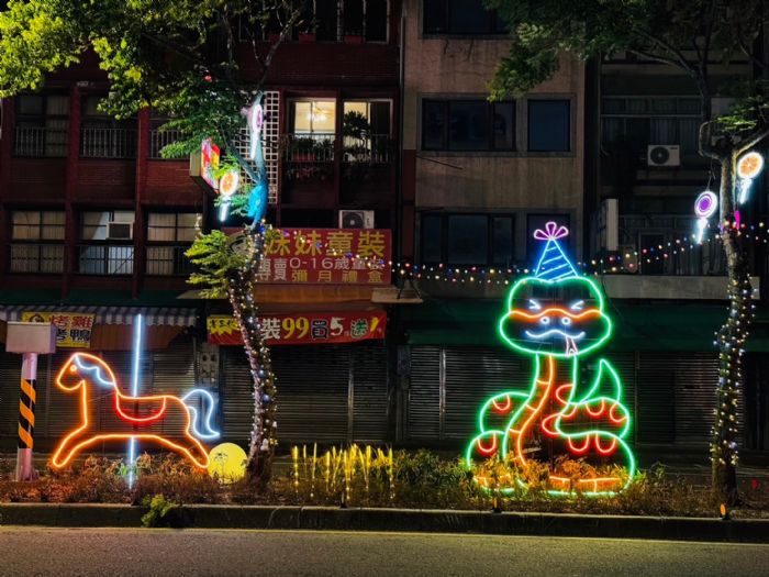 「新明遊樂園」結合台灣燈會主題,以三座可愛又吸睛的造型藝術燈飾為主,主燈為Q版的蛇,周邊搭配旋轉木馬及馬戲團猴子,並結合小朋友最喜歡的棒棒糖和糖果,在繽紛色彩的燈光下,讓新明市場充滿童趣歡樂的氛圍。燈飾將展示至114年3月14日止,為了讓更多民眾感受到新明市場的煥然一新,市府經發局將舉辦抽獎活動,歡迎前來拍照打卡。