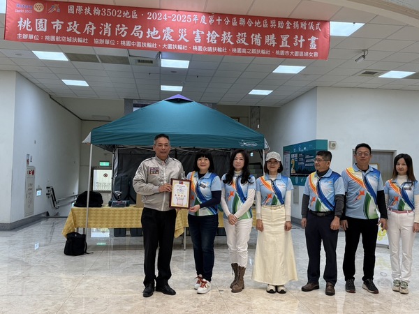 「桃園市政府消防局地震災害搶救設備購置計畫」捐贈案,由國際扶輪 3502 地區第十分區桃園市航空城扶輪社主辦,桃園中區扶輪社、大園扶輪社、桃園永晴扶輪社、桃園高之鐵扶輪社及桃園市大園區婦女會協辦,因其對消防人員守護市民及付出的努力深感認同,共同捐贈桃園市政府消防局特搜大隊消防救災器材1批,於1月16日在桃園市政府消防局1樓大廳舉行捐贈儀式,並由消防