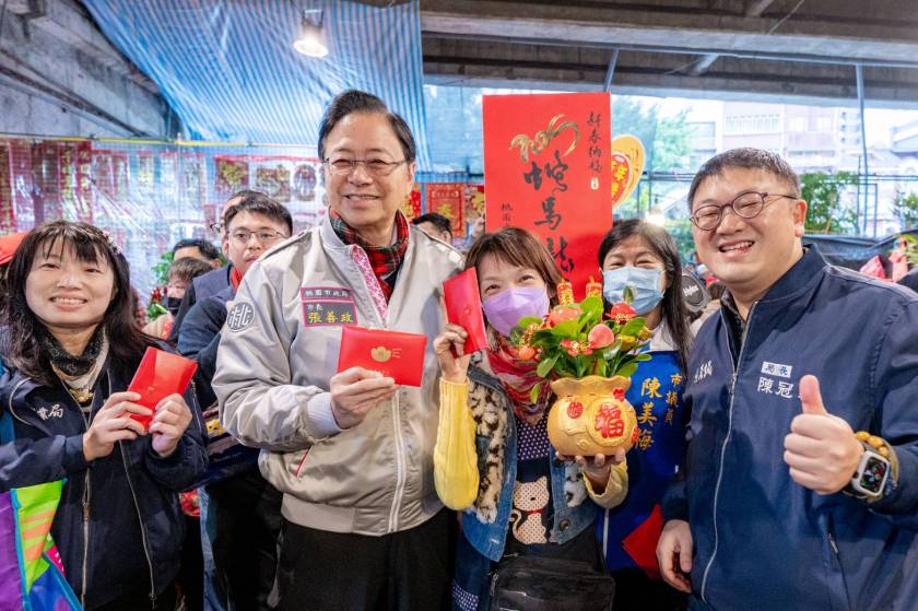 桃園市長張善政19日上午前往桃園假日花市,出席「市長拜早年-桃園假日花市」活動,向辛勤的攤商及採購民眾拜早年,並巡攤發放福袋。張市長表示,感謝桃園市園藝花卉協會的攤商朋友,用心準備多樣化的年節花卉商品,歡迎市民前往採買,為新春增添喜氣,共同迎接小龍年。