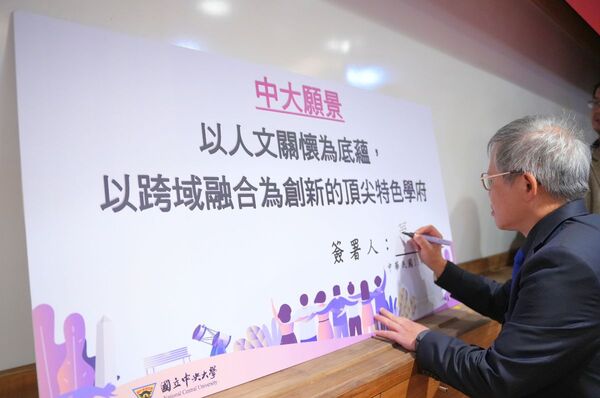 中央大學新任蕭述三校長簽署中大願景,將打造中大「以人文關懷為底蘊、以跨域融合為創新」的特色頂尖學府。
