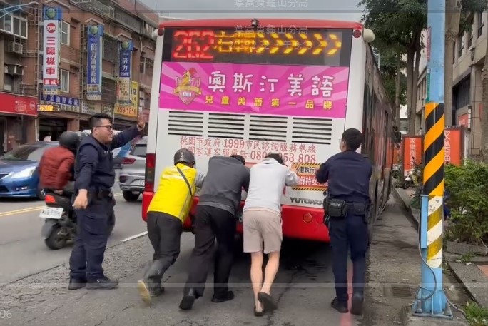 龜山區有一輛市區公車21日下午拋錨在路中央,司機疏散乘客後擔心阻礙交通求助警方,線上巡邏員警到場評估後向所內同仁求援,共5名員警使勁推想協助公車移置路旁安全處,民眾見狀紛紛上前協助警方,在警民合作下終於順利推動十幾噸的公車,也讓路口交通恢復順暢。