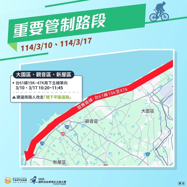 楊梅分局為確保選手及車隊安全,將於台61線、中山西路三段、台15線及台66線等路段實施交通管制,具體措施如下: